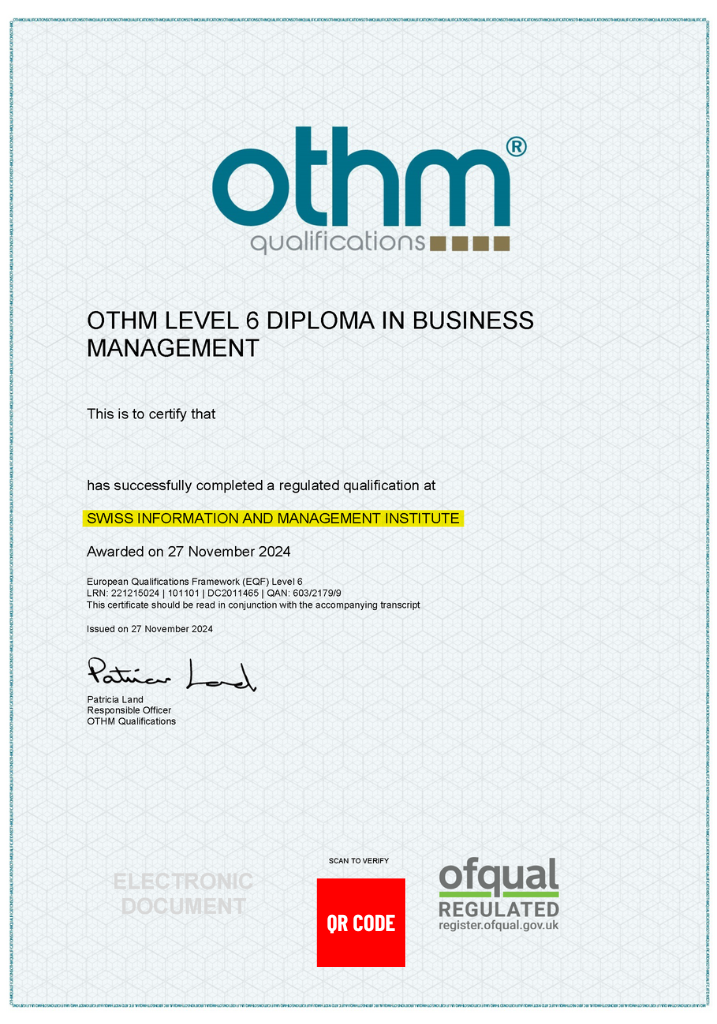 The OTHM Level 5 Extended qualification (issued under the name SIMI – Swiss Information and Management Institute) is recognised for employment in Switzerland without any additional procedures, as positions within the Business and Management group fall under non-regulated occupations that do not require a professional licence.